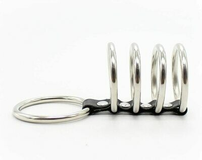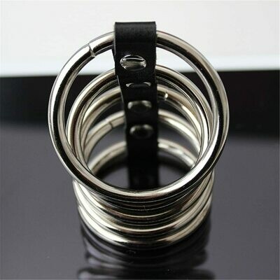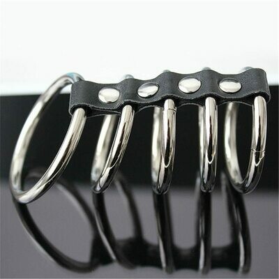 This sexy BDSM bondage will take your cock through the 5 gates of hell. The chastity device features PU leather strap and 5 plated stainless steel cock rings. Enhance the appearance and duration of your erection and the quality of your climax with its intricate design.