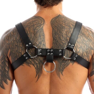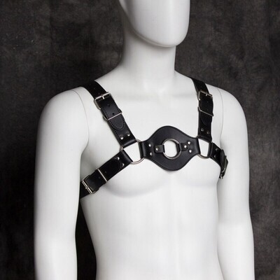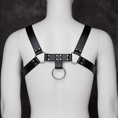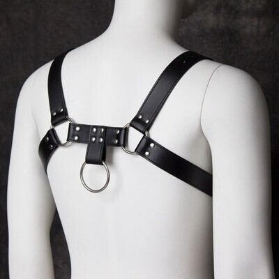 This is stunning fetish leather chest harness. Wear this harness at clubs, bars, or in private, show off your chest and pecs in style and stand out from the crowd. Who says that strap-on dildos are only worn around the waist? This product will prove otherwise! The harness is made of quality PU leather, this fetish gear adds a kinky look when worn, making it ideal for roleplaying and fulfilling fantasies. When using it you can pick either side, front with an O-ring loop or the one with just a centre O-ring. For extra kinky sex, you can attach your favourite dildo into the centre harness, the O-ring can accommodate most dildos. Strap on your dildo by slipping its flared base into the ring. Make the harness secure around your chest by ensuring the straps are buckled.