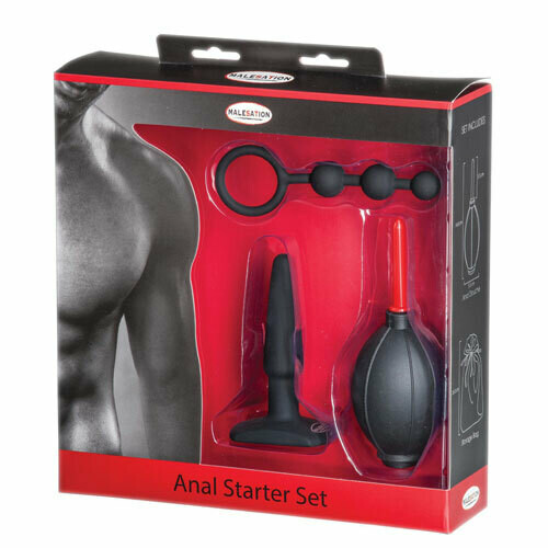 The Anal Starter Set is part of the Malesation range. This Beginners kit has been designed to have all the essentials you will need to introduce anal play into the bedroom. This Anal Set comes with a douche (to ensure everything is clean), small anal beads, and a small butt plug. If you are not too sure about how to introduce anal play into your sex life, or you are not sure which toys would be best to use – then this kit is the perfect match for you. The Anal Douche will ensure you or your partner is completely clean before you start experimenting. The Anal Beads are small, soft and flexible – there is also a loop at the end to make for easier extraction (it will also ensure that they don’t get lost up there). The small t-shaped anal plug is soft, and flexible, making it the perfect butt plug to wear while having sex or using other sex toys. Use a water-based anal lubricant with this beginners anal kit, to ensure you really have the best experience you can.