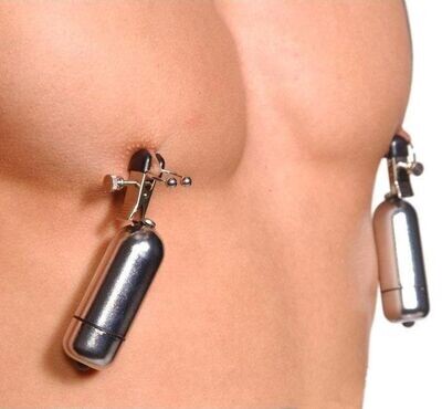 A powerful one touch vibrating wireless sex toy. These silver babies will shake practically anything you attach the clamps to. Easy to use, just unscrew the egg to remove the battery seal then apply the cover. Now just press the little black button. The rubber coated clamps are adjustable to achieve the desired pressure. Can also be a lot of fun attached to the scrotum, penis and other very sensitive areas of the body. Black rubber tips provide even pressure as they clamp down upon you. Adjust the intensity of the clips for the perfect balance of pleasure and pain. Turn on the vibrations and send irresistible stimulation to your sweet spots.